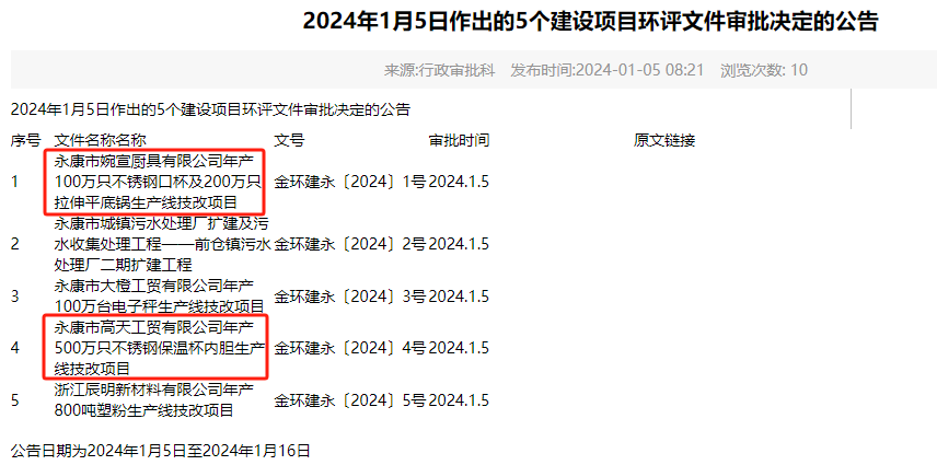 據顯示,涉及不銹鋼項目有2個(gè),分別為:永康市婉宣廚具有限公司年產(chǎn)100萬(wàn)只不銹鋼口杯及200萬(wàn)只拉伸平底鍋生產(chǎn)線(xiàn)技改項目、永康市高天工貿有限公司年產(chǎn)500萬(wàn)只不銹鋼保溫杯內膽生產(chǎn)線(xiàn)技改項目。