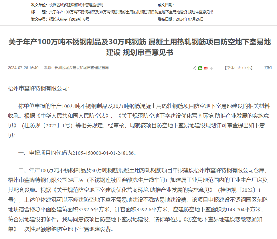 7月26日,梧州市鑫峰特鋼有限公司年產(chǎn)100萬(wàn)噸不銹鋼制品及30萬(wàn)噸鋼筋混凝土用熱軋鋼筋項目防空地下室易地建設規劃獲審查意見(jiàn),據顯示,獲同意通過(guò)。